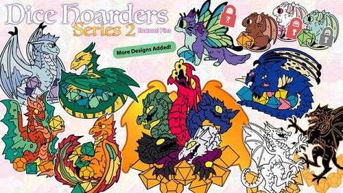 A series of successful Kickstarters to fund the production of pins depicting dragons with their hoards of polyhedral dice.